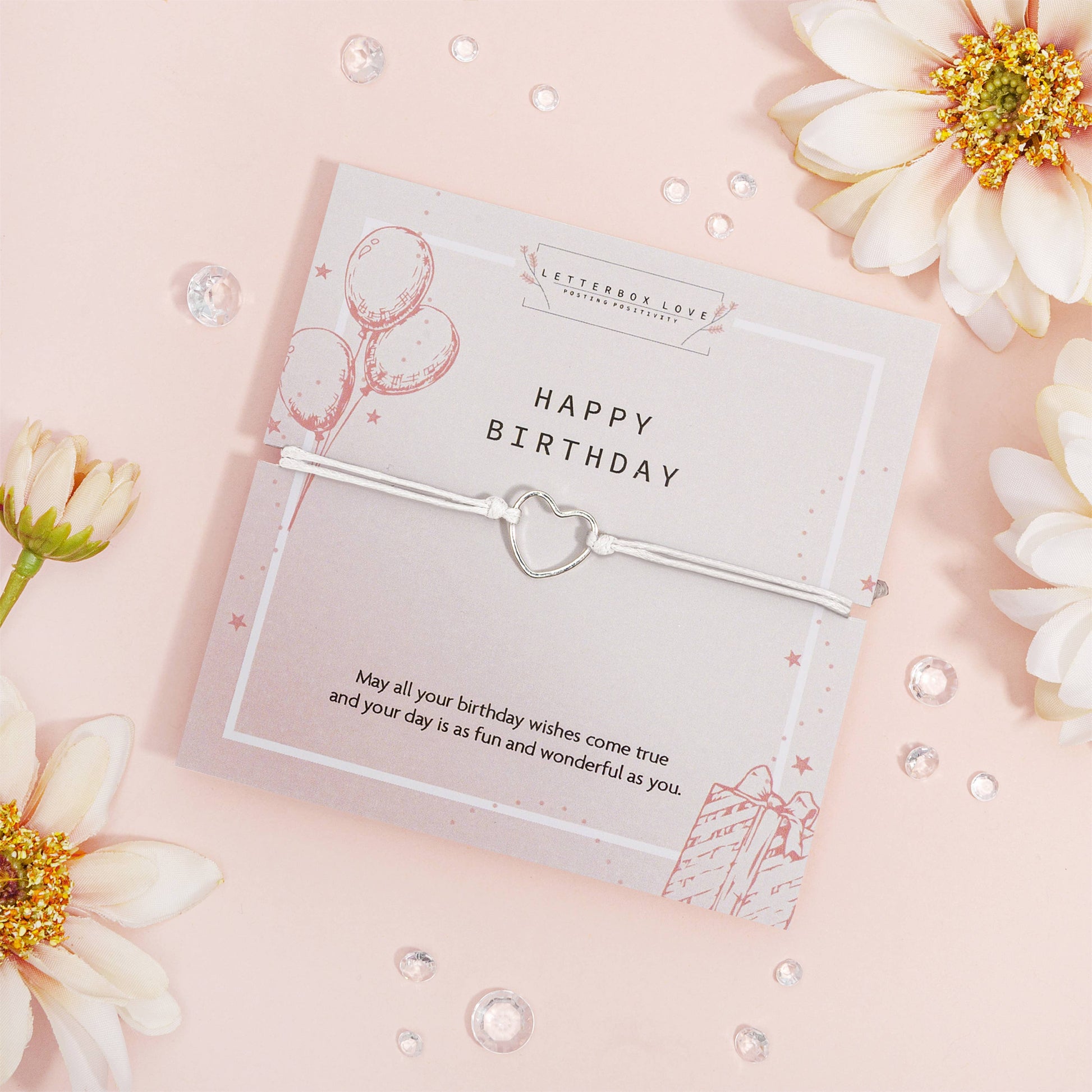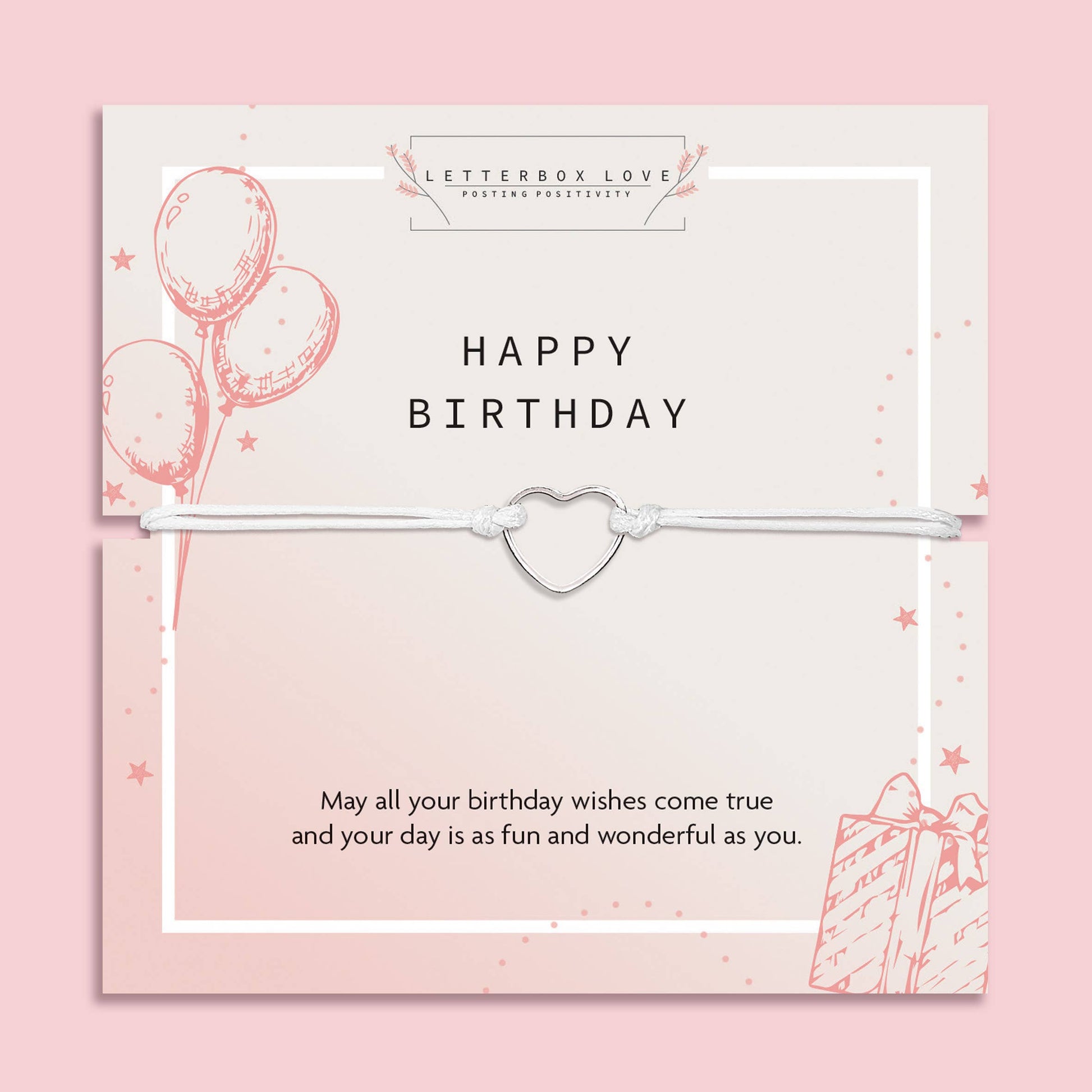 May all your birthday wishes come true and your day is as fun and wonderful as you. Celebrate her special day with a meaningful bracelet gift! Our bestselling birthday bracelet features a hollow heart charm on soft white thread, mounted on a celebratory poem card. Thoughtful, lightweight, and perfect for letterbox gifting, it's a bestseller for gift shops, boutiques, and birthday displays.