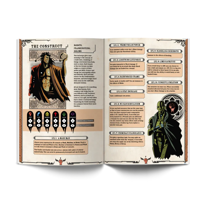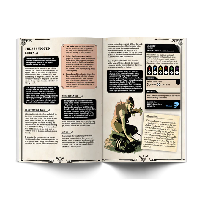 Spireholm provides the perfect sandbox setting for you to create your own stories in and this book also contains a huge 10 part story to play through as well as monsters, items, and NPCs. Fight your way through ghoul infested abandoned buildings, sleuth out a murder mystery, pull off a grand heist and fight werewolves, vampires, and monsters galore in this most Gothic of setting and story.
