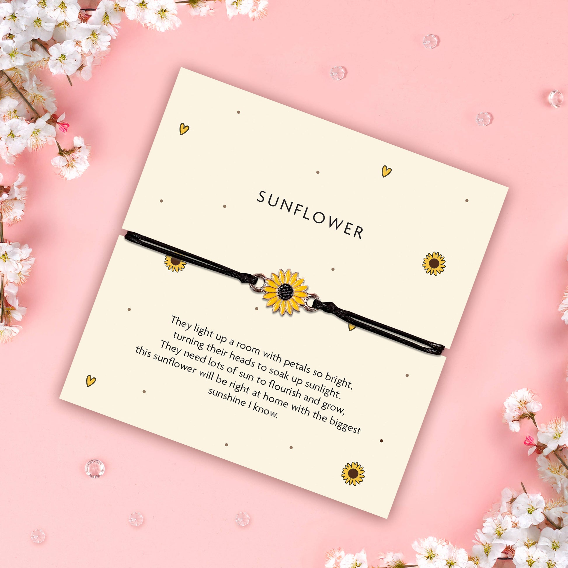 A little token for the one who lights up every room. Featuring a sunflower charm on an adjustable black thread bracelet, this heartfelt keepsake is mounted on a beautifully illustrated card with a cheerful, sunshine-inspired poem:
